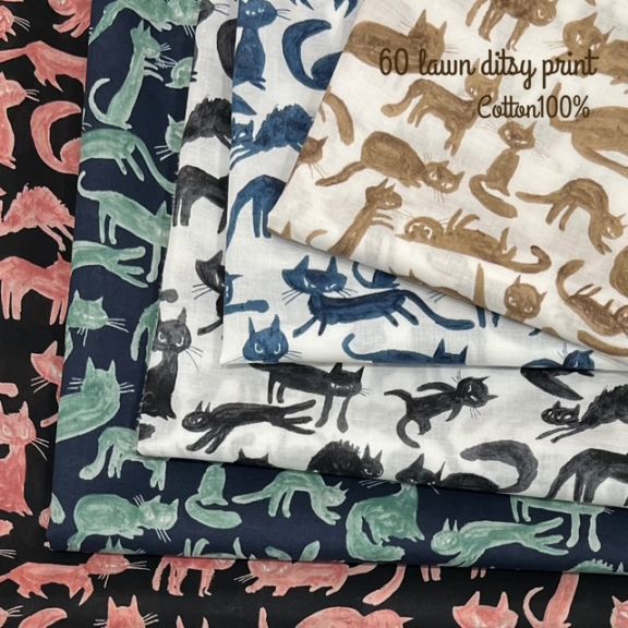 ヴィンテージ 猫 ネコ ねこローン生地 60ローン コットン 100% アニマル ローン 生地 布 光沢感 薄手 生地 平織 透け感 肌触り 上品 日本製 入学入園 新着ローン生地