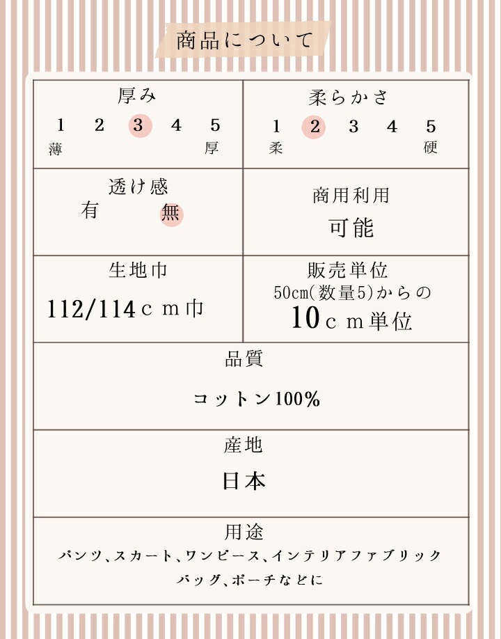 | ご購入方法・ご注意 | 表示価格は長さ10cmあたりの価格です。 【10cm単位で販売】 50cm(数量5)からの10cm単位でのカット販売となります。 →50cm未満(数量1~4)のご注文はキャンセルとさせて頂きます。 1mをご希望の方は個数を「10」でご注文してください。 [注文例] 数量1~4:キャンセルとなります。 数量5:50cmの生地となります。 数量10:1mの生地となります。 モニター発色の具合により色合いが若干異なる場合があります。あらかじめご了承ください。 ・折り畳んで発送になります。畳みシワができますのでご理解の上ご注文をお願い致します。 |