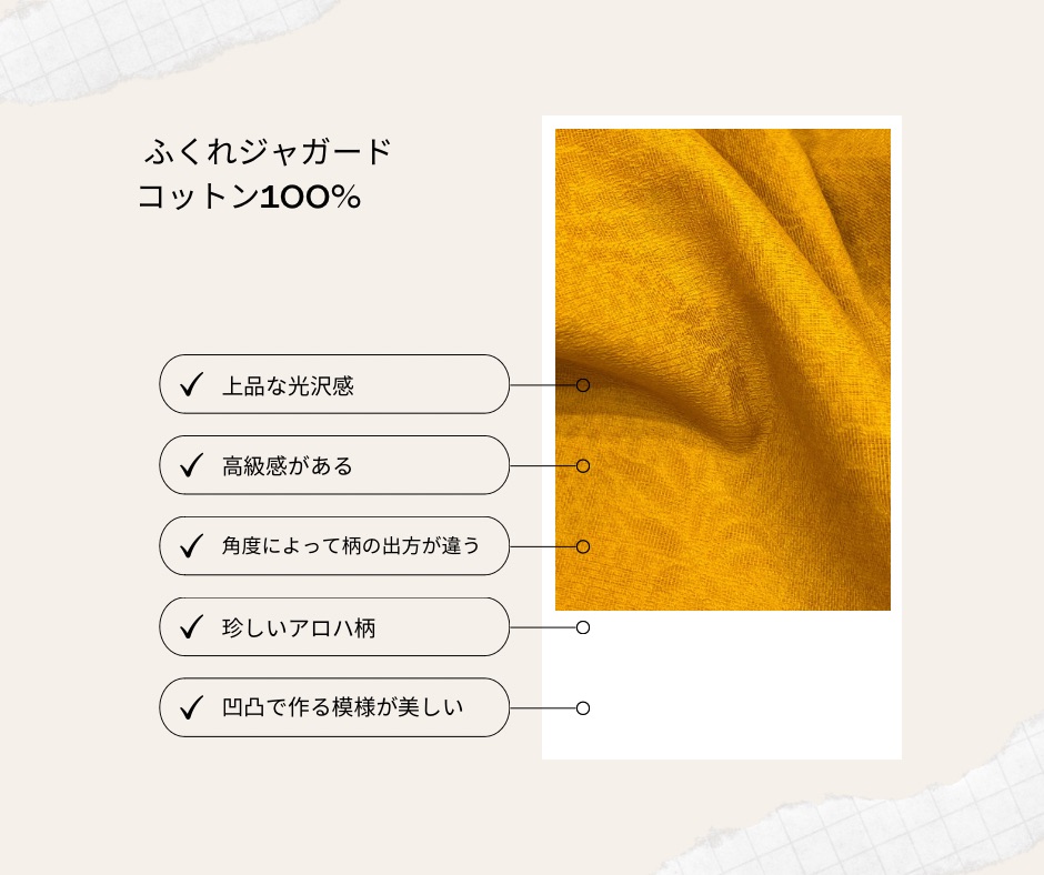 | 商品説明 | フクレジャガードとは表面に柄が浮き出るように織られたジャガードで、素材表面が見る角度や光の加減で変化する表情豊かな生地です。 またエアタンブラー加工によりハリはありますが肌触りの良い独特の風合いに仕上がっております。 |