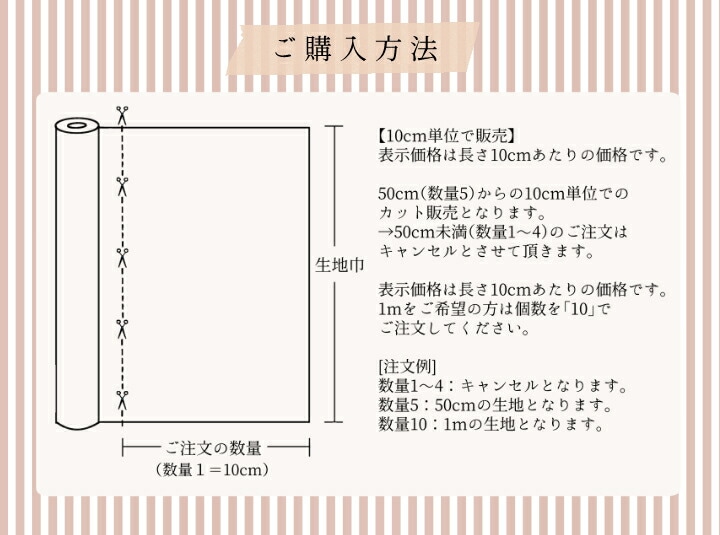 | ご注意・ご購入方法 | 注意・モニター発色の具合により色合いが若干異なる場合があります。あらかじめご了承ください。 ・折り畳んで発送になります。畳みシワができますのでご理解の上ご注文をお願い致します。 表示価格は長さ10cmあたりの価格です。 【10cm単位で販売】 50cm(数量5)からの10cm単位でのカット販売となります。 →50cm未満(数量1~4)のご注文はキャンセルとさせて頂きます。 1mをご希望の方は個数を「10」でご注文してください。 [注文例] 数量1~4:キャンセルとなります。 数量5:50cmの生地となります。 数量10:1mの生地となります。 |