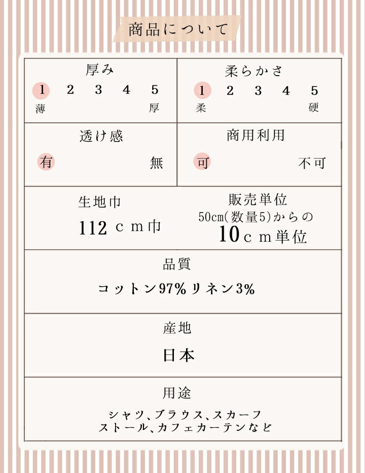 | 商用利用 | 可能 ※当店の生地は全て商用利用可能です。 |