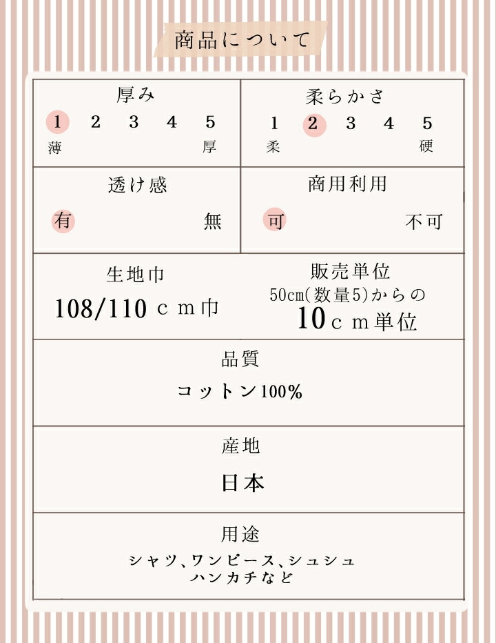 春夏シャツ・ブラウスによく使われ、ハンカチやストールなどの雑貨にも幅広くお使い頂けます。