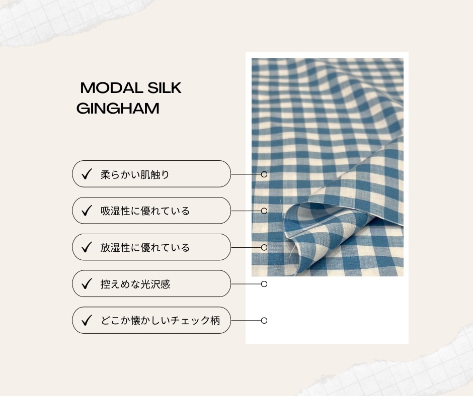 | 商品説明 | モダールとシルクの混紡糸を使用した、柔らかなタッチが特徴。 薄手で軽く、ナチュラルな光沢感としなやかな風合いが魅力です。 どこか懐かしいチェックがかわいい生地。 |