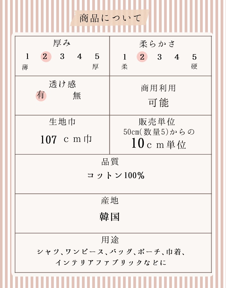 | ご注文方法・ご注意 | 【10cm単位で販売】表示価格は長さ10cmあたりの価格です。 50cm(数量5)からの10cm単位でのカット販売となります。 →50cm未満(数量1~4)のご注文はキャンセルとさせて頂きます。 表示価格は長さ10cmあたりの価格です。 1mをご希望の方は個数を「10」でご注文してください。 [注文例] 数量1~4:キャンセルとなります。 数量5:50cmの生地となります。 数量10:1mの生地となります。 モニター発色の具合により色合いが若干異なる場合があります。あらかじめご了承ください。 ・折り畳んで発送になります。畳みシワができますのでご理解の上ご注文をお願い致します。 |