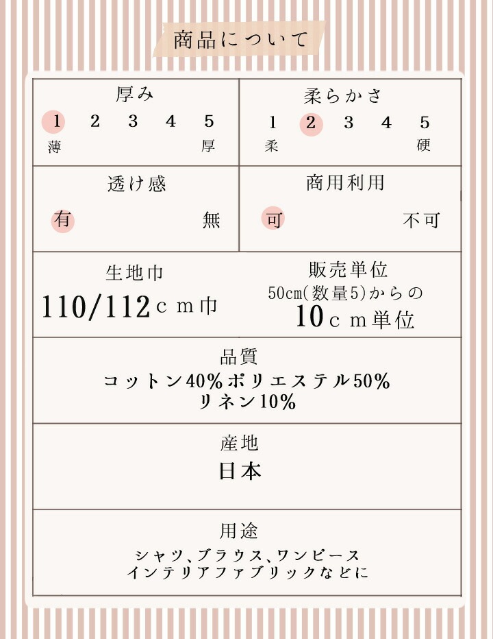 | 材質 | コットン40%ポリエステル50%リネン10% |