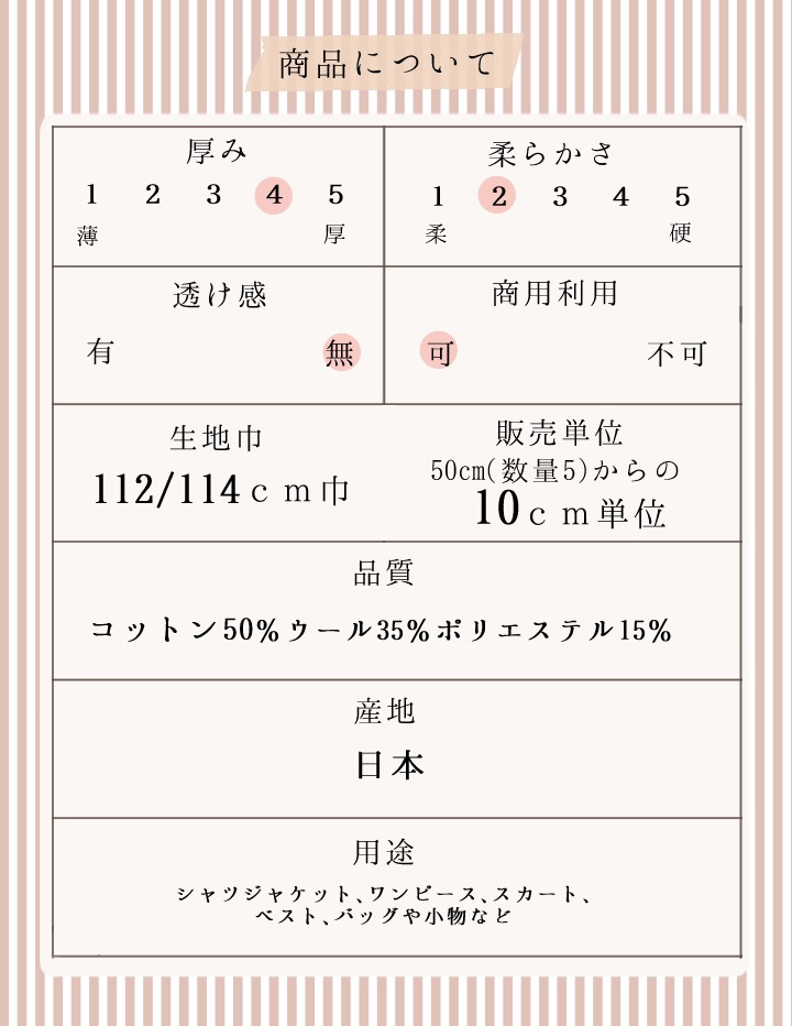 程よい厚みとハリ感があり、仕立て映えする質感。