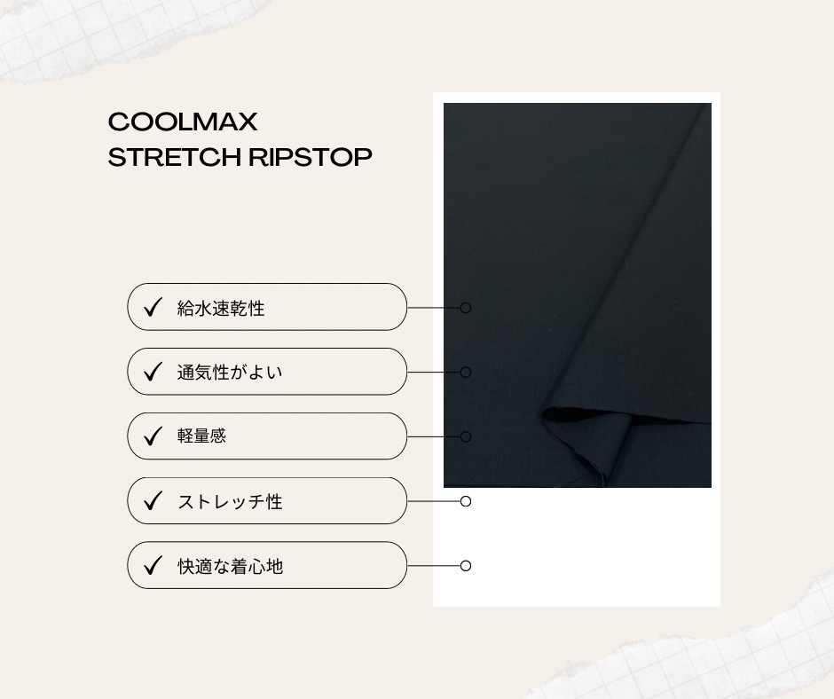 さらに、ストレッチ性を持たせることで、動きやすさと着心地も向上。アクティブなシーンや日常使いにも最適です。クールマックスの特長である通気性と速乾性に加え、リップストップの耐久性、ストレッチの快適性を兼ね備えた高機能ファブリックです。