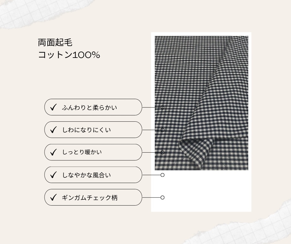 | 特徴 | 薄手で柔らかく温かい起毛生地です。 シャツやワンピース、バッグなど冬のハンドメイド作品にいかがでしょうか。 |