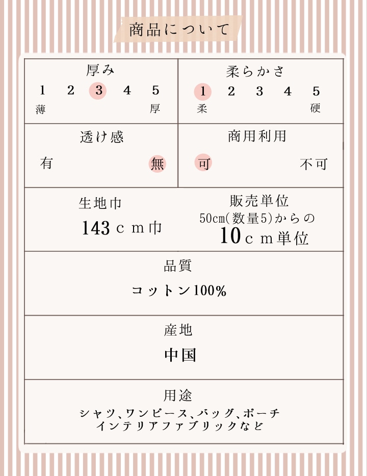 | 商用利用 | 可能 ※当店の生地は全て商用利用可能です。 |