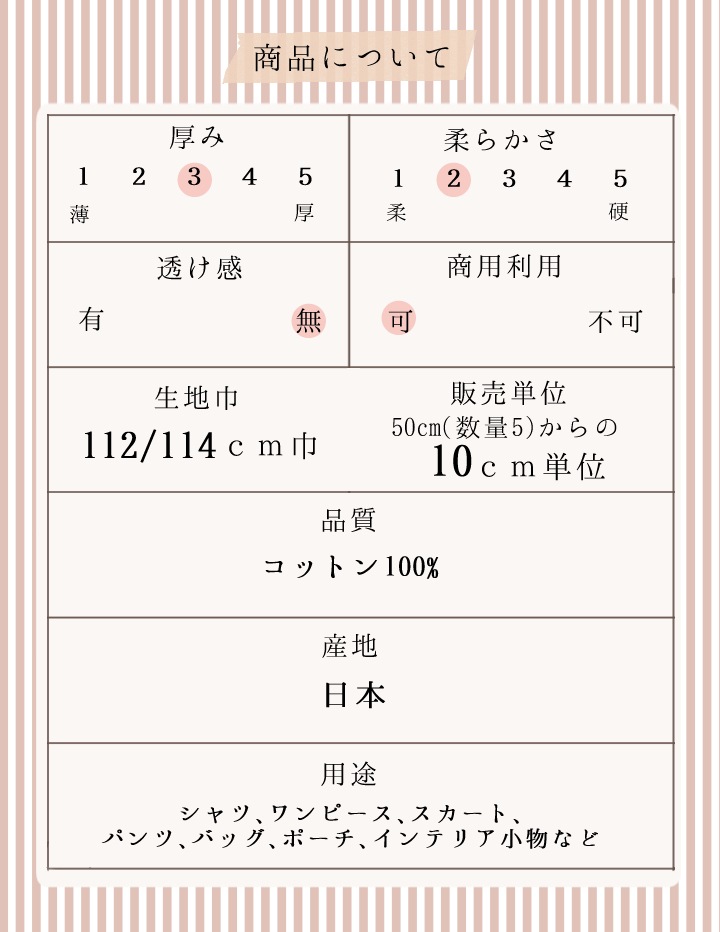 厚みは適度で扱いやすく、シャツ、スカート、ワンピースなどのウェアから、バッグやクッションカバーなどの小物まで幅広くご使用いただけます。