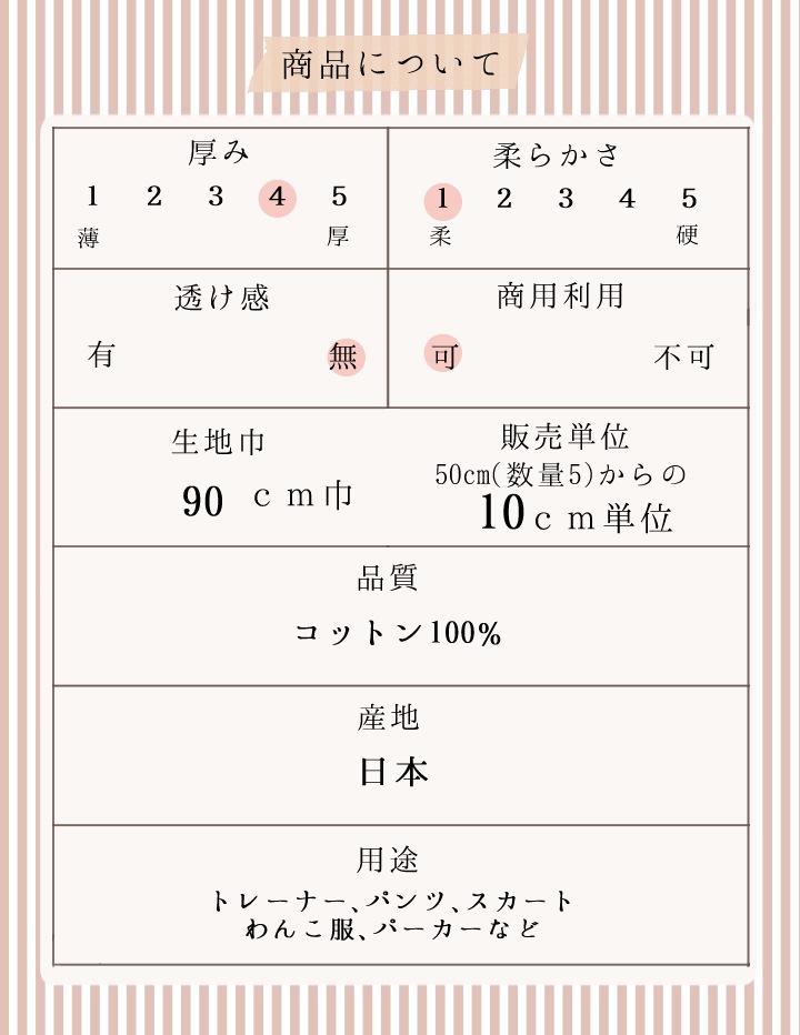 カラー展開も豊富で、シンプルながらおしゃれな無地デザインは、パーカーやスウェット、ワンピースなどの洋服はもちろん、バッグやポーチなどの雑貨にも最適。ベーシックからアクセントカラーまで揃えていますので、作品づくりの幅が広がります。