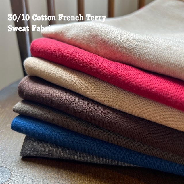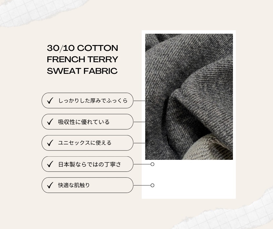 しっかりとした厚みと柔らかさを兼ね備えた 30/10 裏毛スウェット生地。