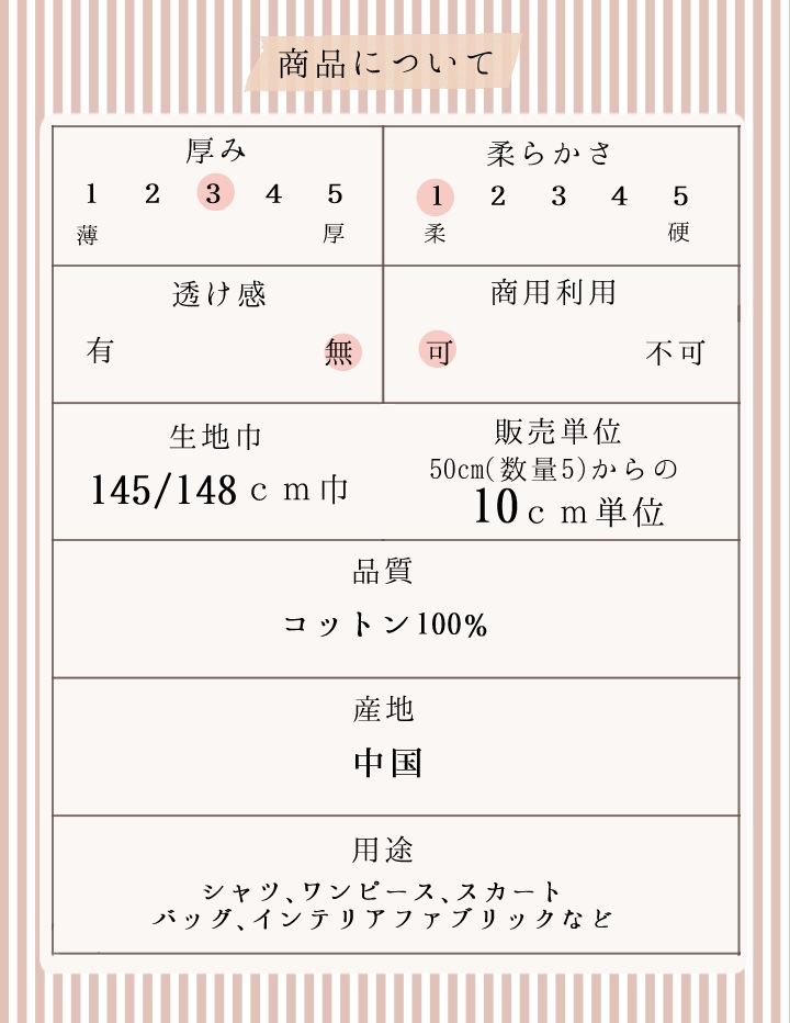 | 商用利用 | 可能 ※当店の生地は全て商用利用可能です。 |