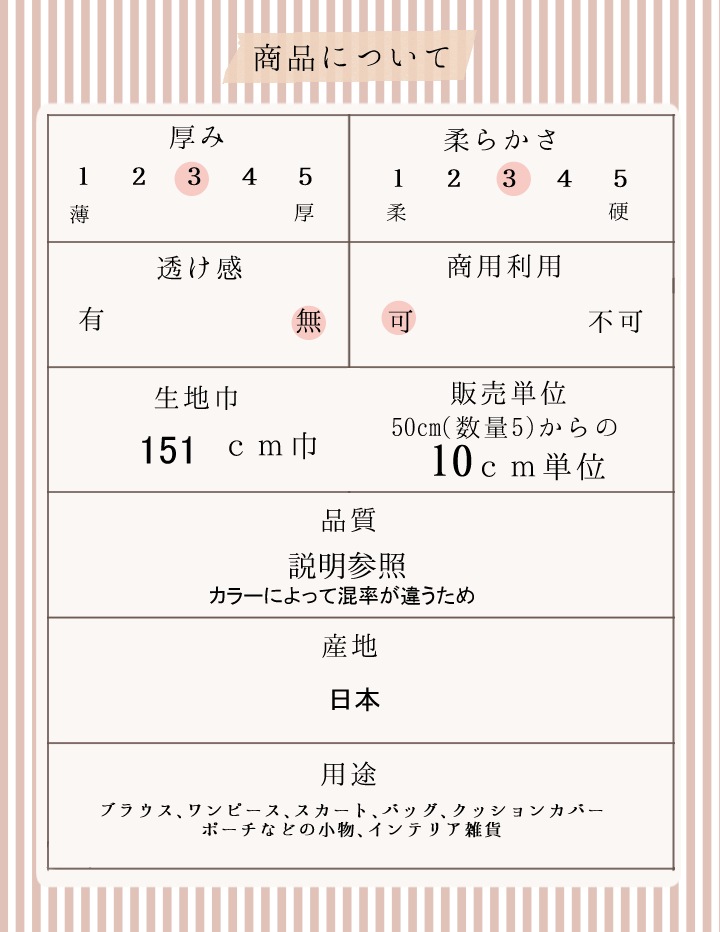 洋裁初心者の方から本格的な洋服づくりまで幅広く対応可能な素材です。