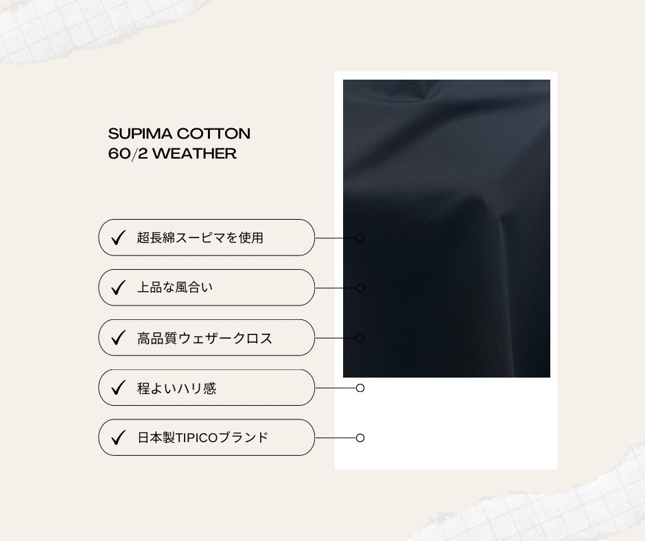 スーピマコットン60/2を高密度に織り上げた日本製ウェザークロスです。