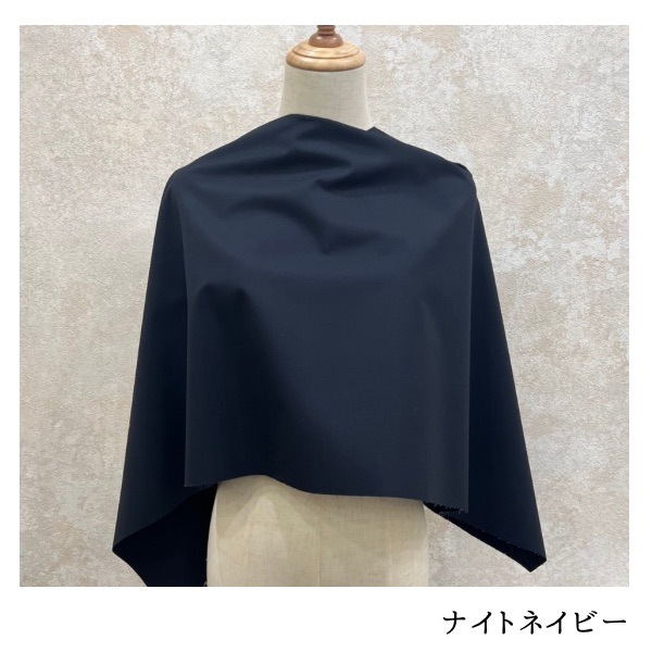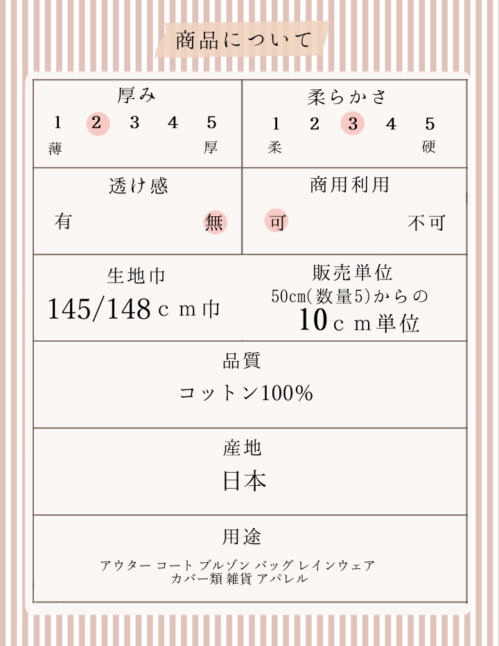 生地幅は145/148cmで扱いやすく、綿100%のため肌当たりも良好。仕立て映えする万能な高密度生地です。